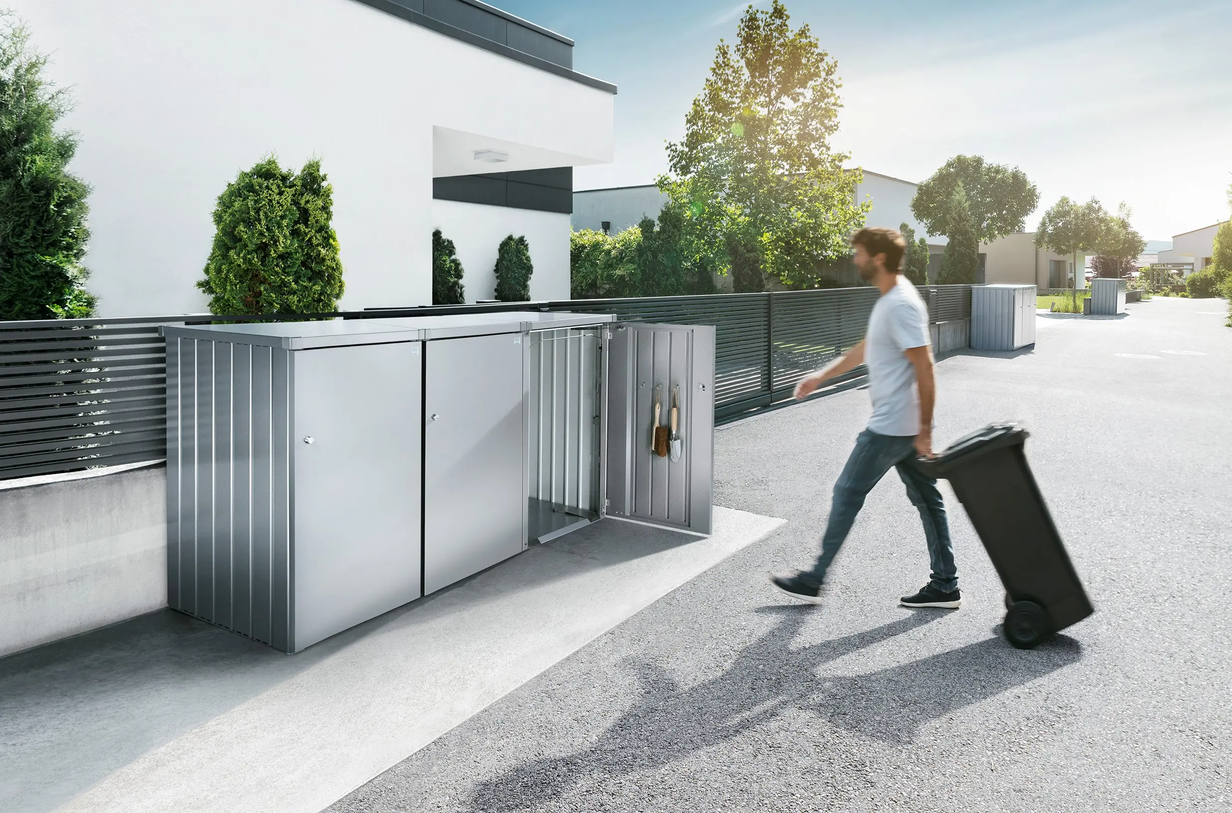 Con el nuevo sistema de armarios para cubos de basura modulares Alex®, se puede disponer cualquier número de cajas en fila, incluso retrospectivamente, y así acomodar de forma óptima los sistemas de separación. El cubo de la basura puede volcarse fácilmente y el soporte de sujeción lo fija en posición inclinada y facilita el llenado. ¡Con su moderno diseño, Alex® destaca en cualquier entrada!
